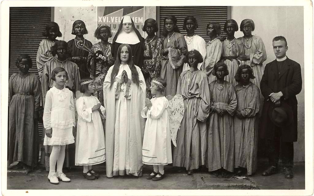 Slika prikazuje skupino, ki je uprizorila misijonsko igro, katere naslov in vsebina nista znana, so pa precej zgovorni kostumi: zgodba se dogaja med temnopoltimi prebivalci daljnih dežel, lačnimi in neukimi zamorčki, oblečenimi v prepasane ohlapne halje. Pravzaprav so, sodeč po frizurah, nastopale samo dekleta in deklice, ki imajo okoli vratov slikovite ogrlice, vsaj tiste, ki igrajo zamorčke; za eno – že spreobrnjeno? – pa se zdi, da ima okoli vratu svetinjo Marijine družbe … Med njimi stoji redovnica, katere red bi kdo bolje poučen opredelil po oblačilu. Deklici ob njej imata bogato, nekoliko po afriško vzorčasta oblačila, dekle s svetinjo Marijine družbe pa nosi obleko, katere zvončasti rokav je obrobljen z belo čipko. Desno od nje je za razliko od ostalih temnopolta deklica v zelo svetli obleki.