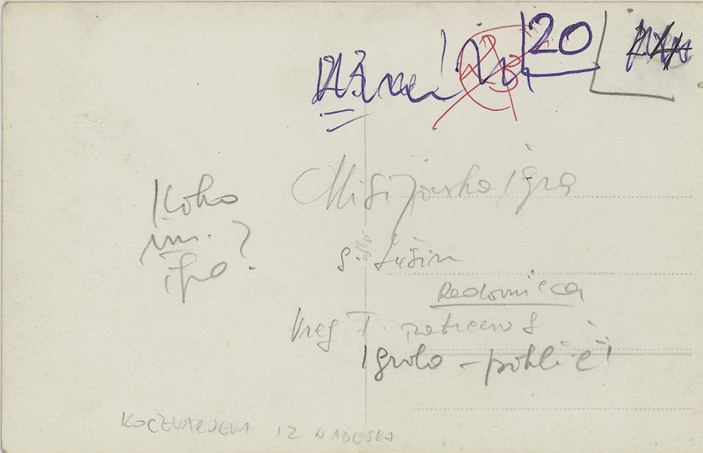 Zapiske na hrbtni strani slike je najbrž vsaj deloma napravil nekdanji starotrški župnik Janez Kebe, ki je med zbiranjem gradiva za svoje knjige o zgodovini Loške doline pridobil tudi veliko starih fotografij, kot je tale … Je čisto spodaj medel zapis “Kočevarjevi iz Nadleska”? Ni mogoče zagotovo reči.