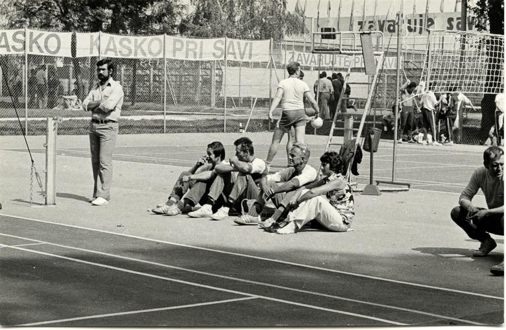 Ob ograji prva temnolasa gospa je Mira Drobnič, za njo se malce vidi Ančko Zidar in sledita še Marjana Širaj in mož Tone Širaj. Ostali so iz drugih ekip.