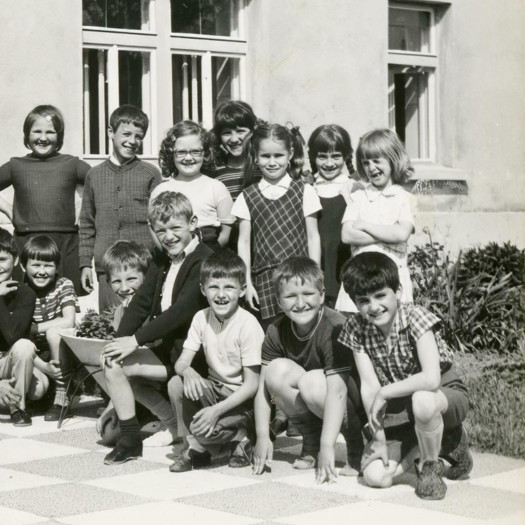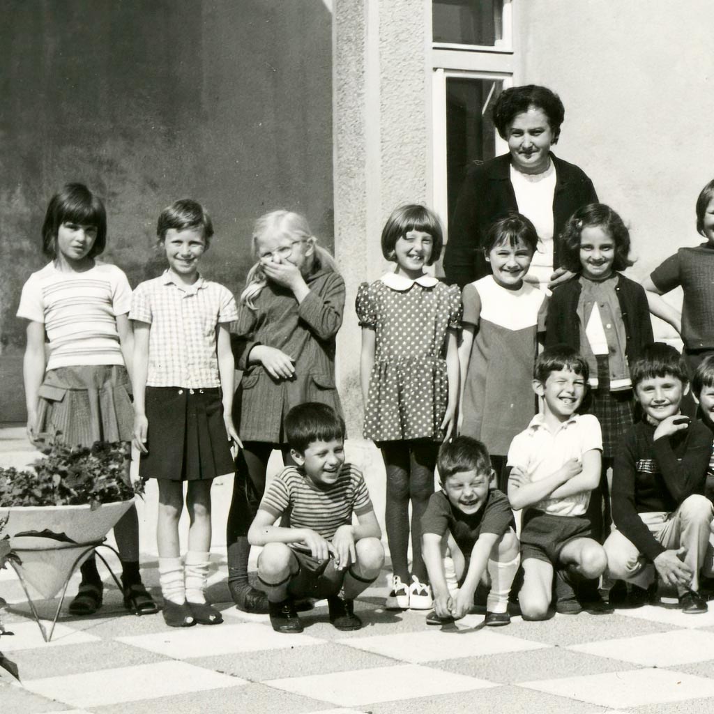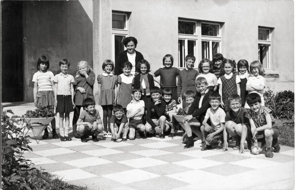 Učenci so slikani pred vhodom v osnovno šolo na Rakeku, vsi nasmejani in dobre volje. Fotograf Bajčkov Jože je vedno znal poskrbeti za dobro vzdušje. Ob svoji razredničarki Tončki Jernejčič so se pa tudi zelo dobro počutili. Bila je kot nadomestna mama. Vedno prijazna, tankočutna, nikoli ni povzdignila glasu. Za pregled domačih nalog je imela svoj ustaljeni red. Šla je od mize do mize. Zvezki z domačo nalogo so jo morali pričakati na robu mize, obrnjeni proti njej. Seboj je imela štampiljko s čebelico, ki je bila nagrada za dobro opravljeno nalogo. Enostavno in učinkovito.