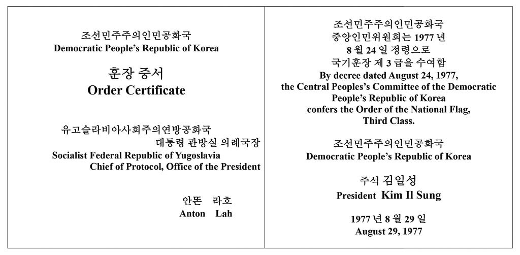 Torej, jedilni list ni jedilni list, ampak dokazilo, da je Centralni komite Demokratične republike Koreje 24. 8. 1977 sklenil, Kim il Sung pa 29. 8. 1977 podelil Orden nacionalne zastave (sicer le tretje stopnje) Antonu Lahu, šefu protokola SFRJ.