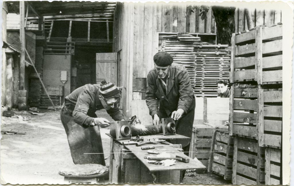 Neznan avtor je ta prizor posnel v sklopu orodjarne v Pudobu. Z leve vidimo Jožeta Martinčiča, ki globoko sklonjen nekaj vari, drugi je domnevno Adolf Nelec, strojni ključavničar in v mladosti tudi kar uspešen smučarski tekač. Delata pred skednjem nasproti nekdanjega hotela Jelen, ki je bil zdaj orodjarna. Zadaj desno k fotografu zre neznan sodelavec.