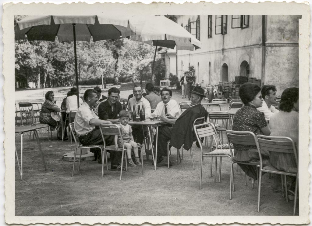 Od leve za mizo v sredini sedijo Jože Martinčič, drugi je neznan, spredaj sedi deček Rajko Martinčič, sledi oče in stari oče Anton Martinčič, predzadnji je Ivan Strle Podklancov, zadnji pa neznan moški v klobuku. Drugi gostje okoli miz so prav tako neznani.
