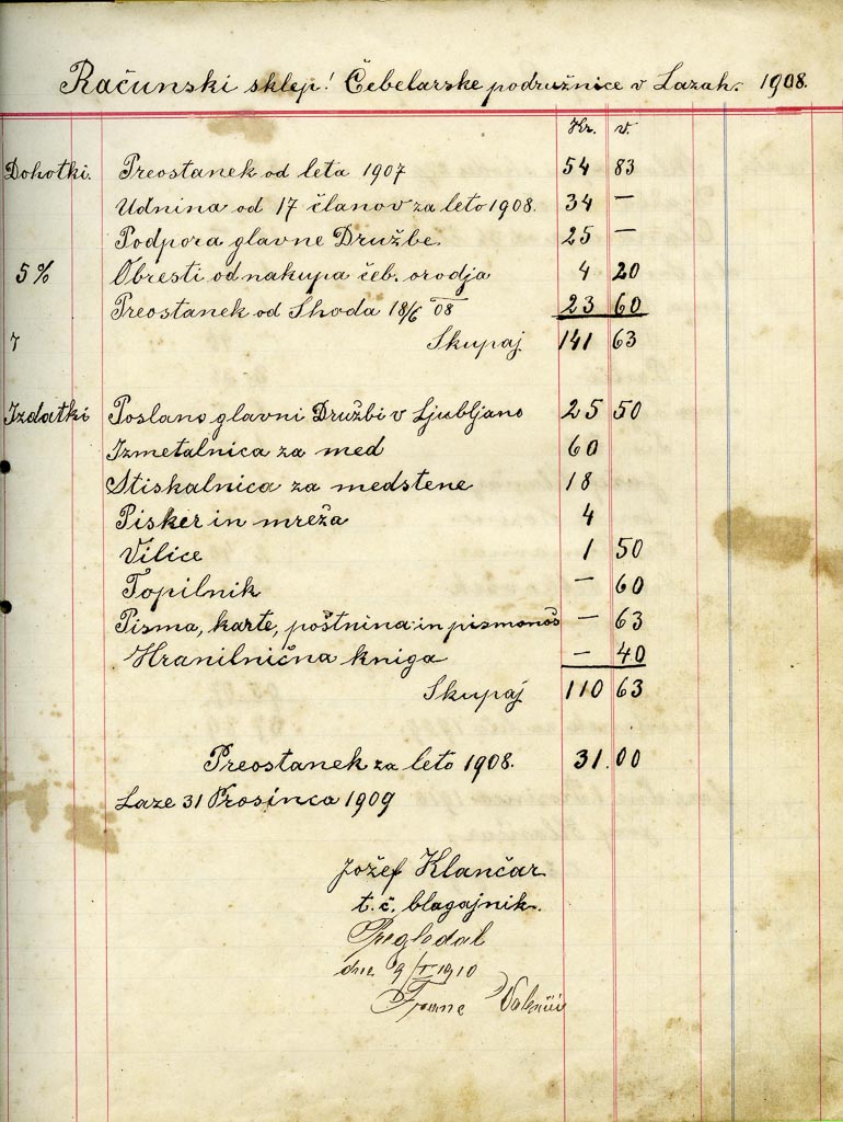 V izdatkih za leto 1909 najdemo tudi Knjigo čebelarske podružnice 2,60 krone. Računski sklepi (finančni podatki) so skrbno vodeni in potrjeni od izvoljenih preglednikov.