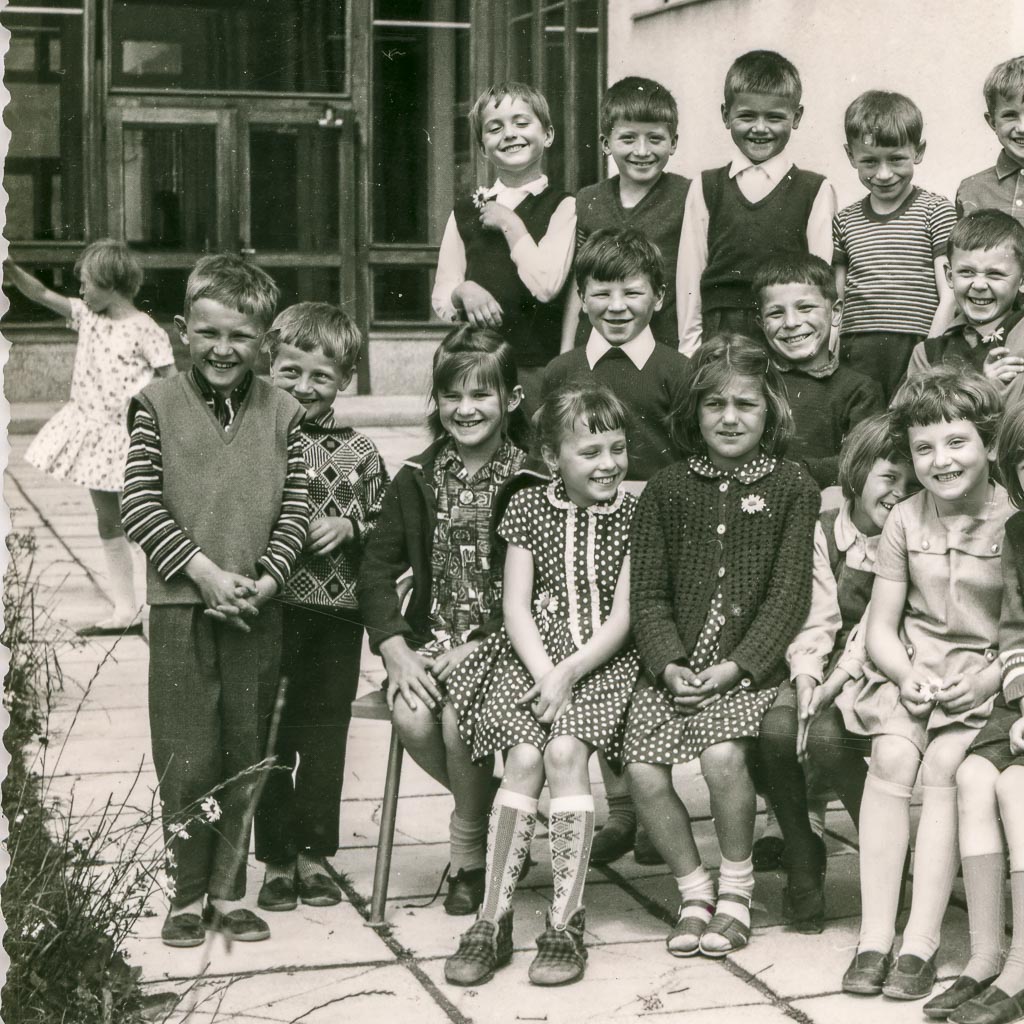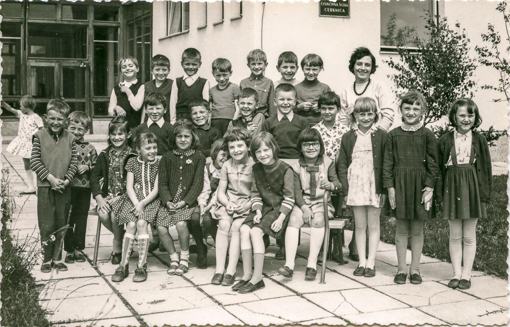 To so učenci letnika 1960, vendar so bili v razredu še štirje mlajši, torej letnik 1961. V razredu je deklica, ki je bila sestrična kar dvema sošolcema. Učenci prvih razredov so vedno tako naravni in prisrčni. Škrbasti nasmeški nas spomnijo na “miško”, ki je prišla po mlečen zobek. Opaziti je rokico z doma sanirano poškodbo na prstu. Povoj, enostavno povito in vsa težava je rešena. Pri nekaterih deklicah in celo dveh dečkih lahko opazimo cvet velike bele ivanjščice, ki so cvetele prav ob robu ploščic. Vsa dekleta so oblečena v krila ali pa v lepe obleke. Nekatere so še v žabah, druge že v dokolenkah. Fantje v srajčkah, brezrokavnikih in nekateri še v puloverjih. Vse to nakazuje na prijetno toplo vreme z rahlim vetrom v laseh. Razredničarka ob njih kar žari.