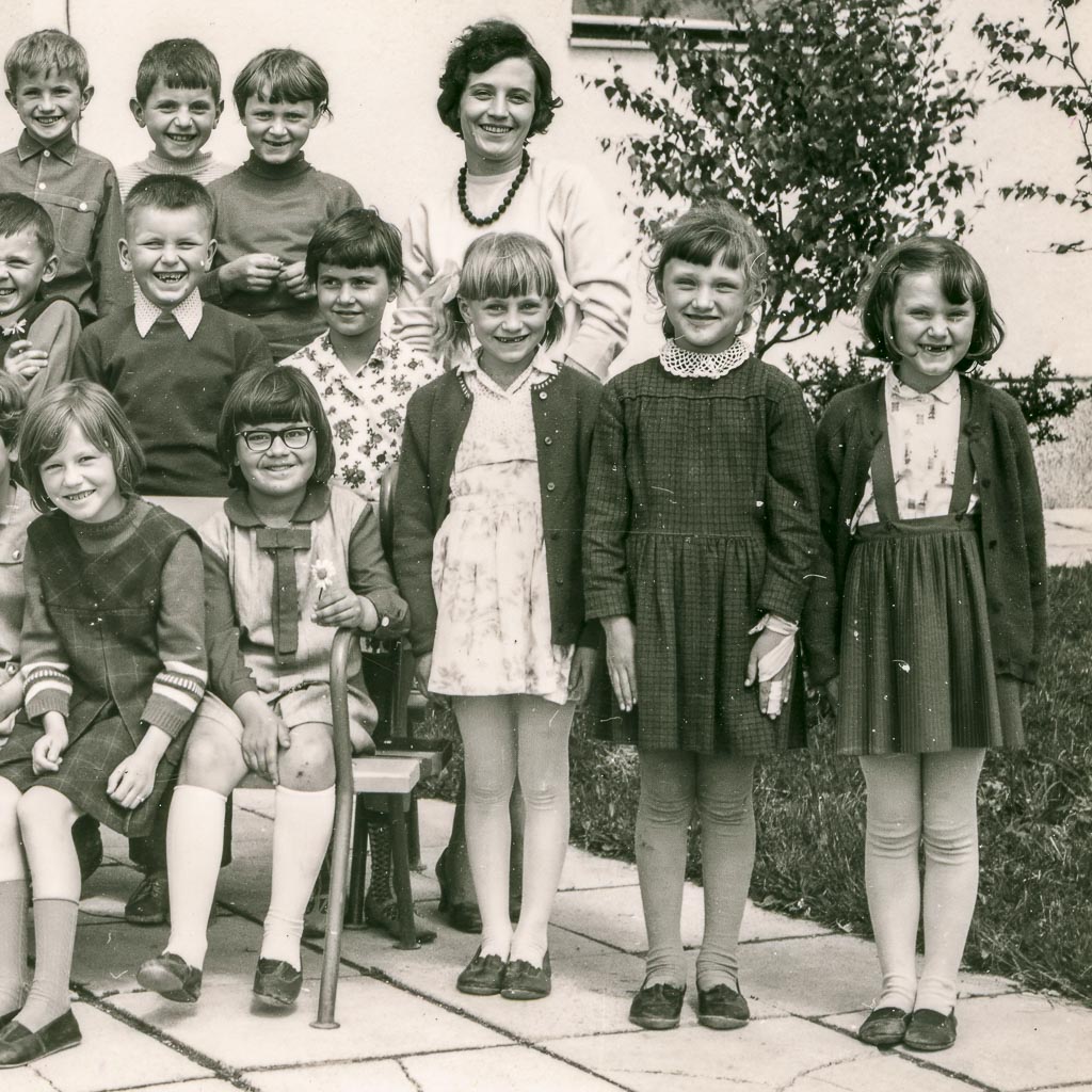 V šolskem letu 1967/68 so se dobro razpoloženi učenci 1. a razreda in razredničarka Jolanda Lah slikali pred osnovno šolo Cerknica.