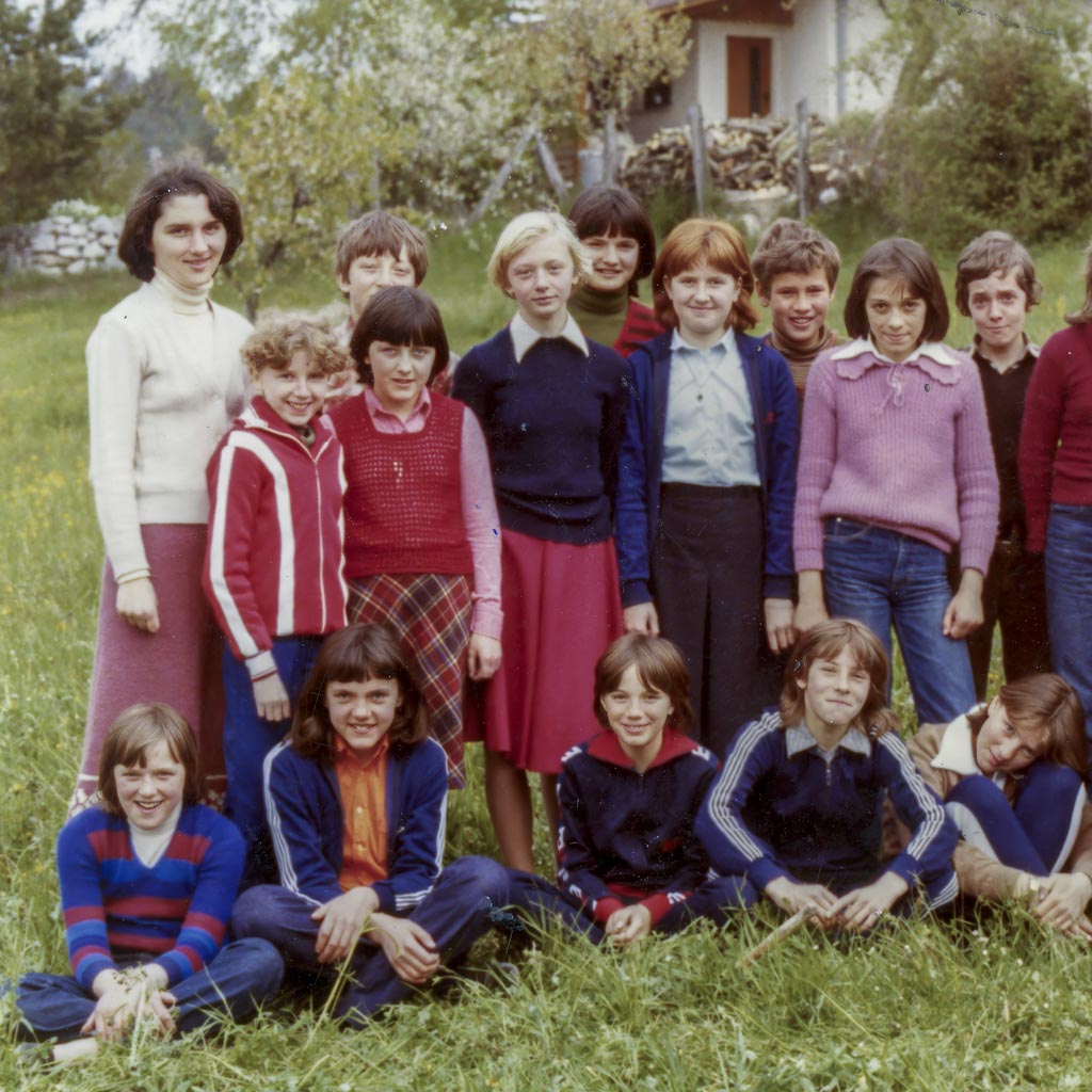 Peti razred se je slikal na šolskem vrtu levo ob šoli. Zadaj vidimo Rovanovo hišo. Na šolskem vrtu so imeli gredice, ki so jih urejali med gospodinjskim poukom in vrtnarskim krožkom.