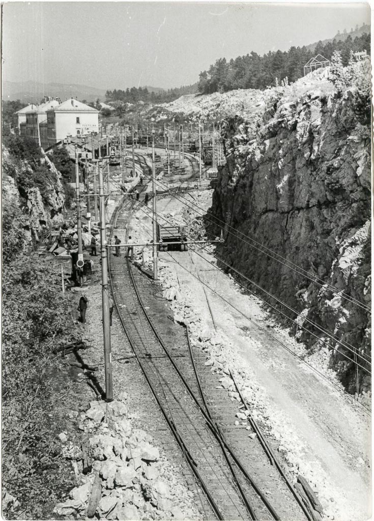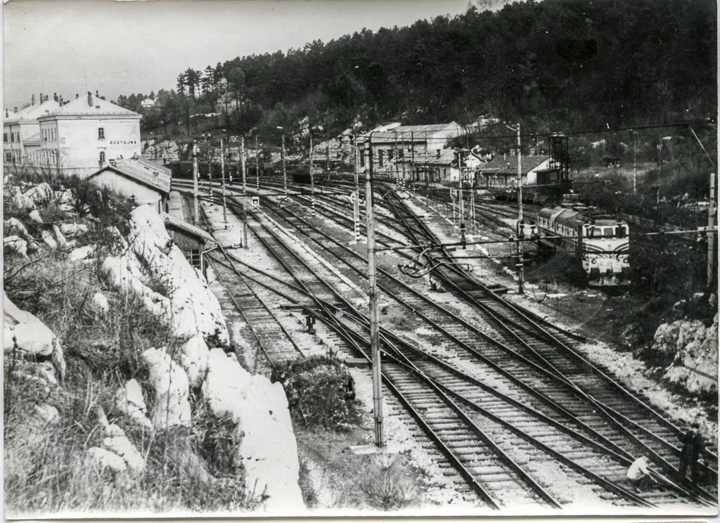 B stran postaje Postojna, ki se je z gradnjo avtoceste najbolj spremenila, a se po tej fotografiji sodeč gradbena dela še niso začela. Postajo so elektrificirali že Italijani leta 1936. Na fotografiji so vidne stavbe, ki so bile porušene leta 1971. Na postaji sta dve električni lokomotivi, obe izdelani v Italiji. V ospredju je lokomotiva JŽ 362 z vzdevkom ‘meh‘, v ozadju pa JŽ 361 ‘Breda‘. ‘Mehi’ so prišli po letu 1960 in fotografija je nastala v obdobju 1960-1970.