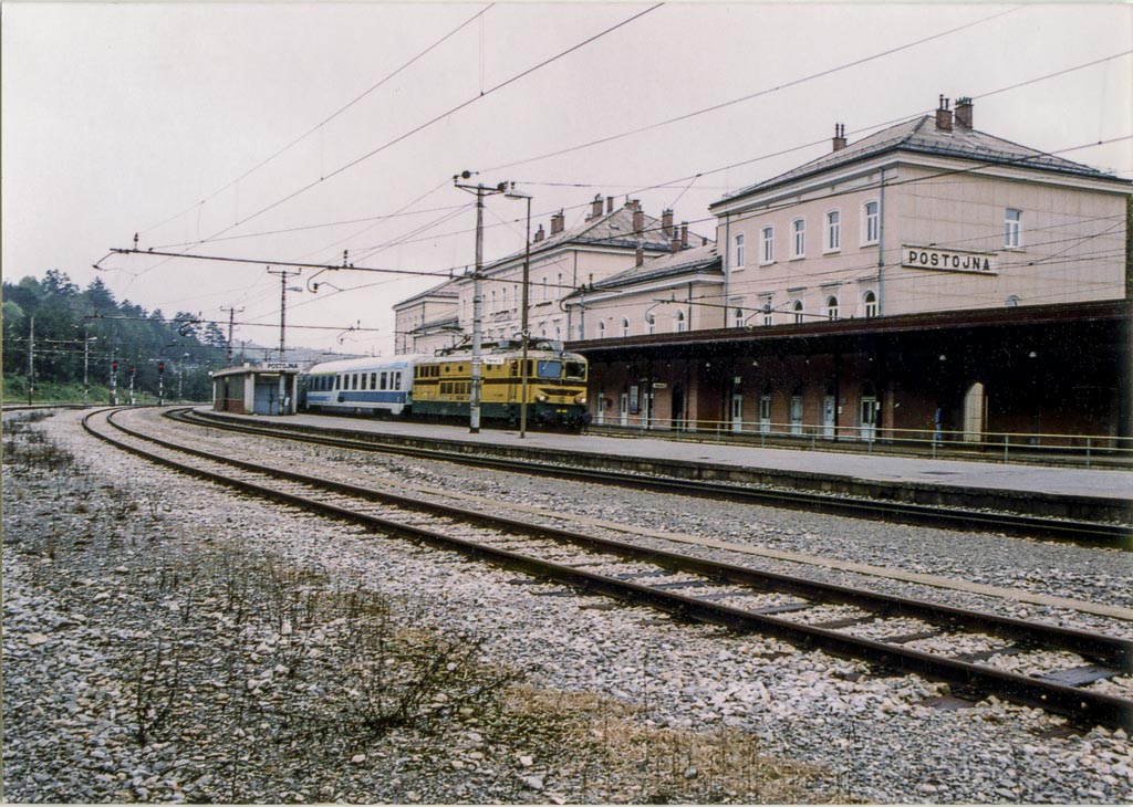 Pa še pogled na postajo Postojna v smeri Kopra. Potniški vagonski vlak z lokomotivo serije SŽ 342, ki je dobila vzdevek moped, pelje proti Ljubljani. Kateri vlak bi to lahko bil? Mogoče vlak št. 482 na relaciji Reka-Ljubljana, lahko pa da je tudi kakšen drugi iz Kopra ali Sežane.