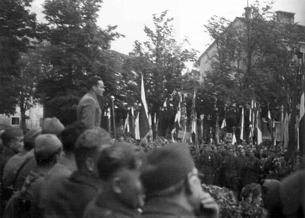 Predsednik Narodne vlade Slovenije Boris Kidrič med govorom na zborovanju v Ajdovščini 5. maja 1945.