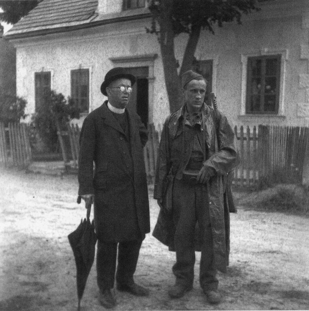 Župnik Josip Pravhar iz Loškega Potoka s fotografom Francem Cerarjem z Leico, Stari trg pri Ložu septembra 1944.