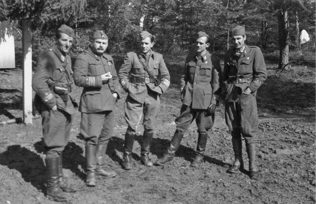 Poveljniški kader Glavnega štaba NOV in POS. Z leve Tone Vidmar, Jaka Avšič, Lado Ambrožič, Franc Tavčar in Mile Kilibarda, Kočevska 1944.