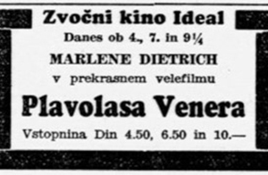 Zadnja dva oglasa sta bolj obvestili. Tu izvemo, da je bil zvočni film še vedno nekaj posebnega, saj tega sicer ne bi posebej oglaševali. In da bo Marlene ob devet in četrt igrala v prekrasnem velefilmu. Naj bo.
