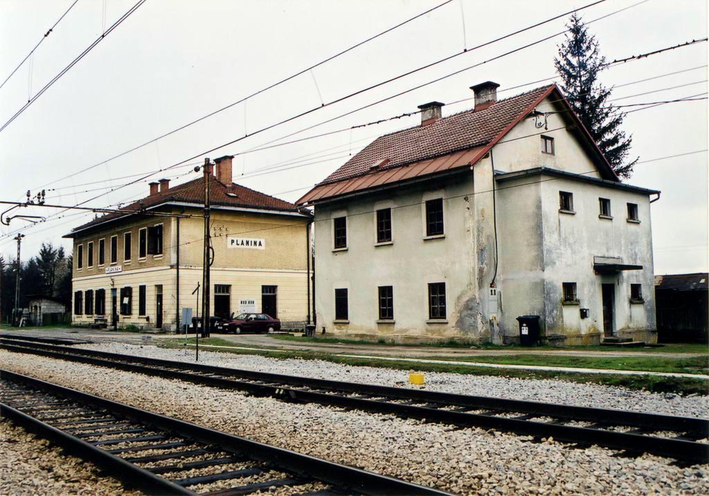 Pogled na postajno poslopje (levo) in pomožni stanovanjski objekt (desno) aprila 2002. Stanovanjski objekt je bil porušen leta 2020. Skrajno levo je še iz kamna zidano javno stranišče, ki je tudi bilo porušeno, na njegovem mestu pa je danes prostor za kolesa.