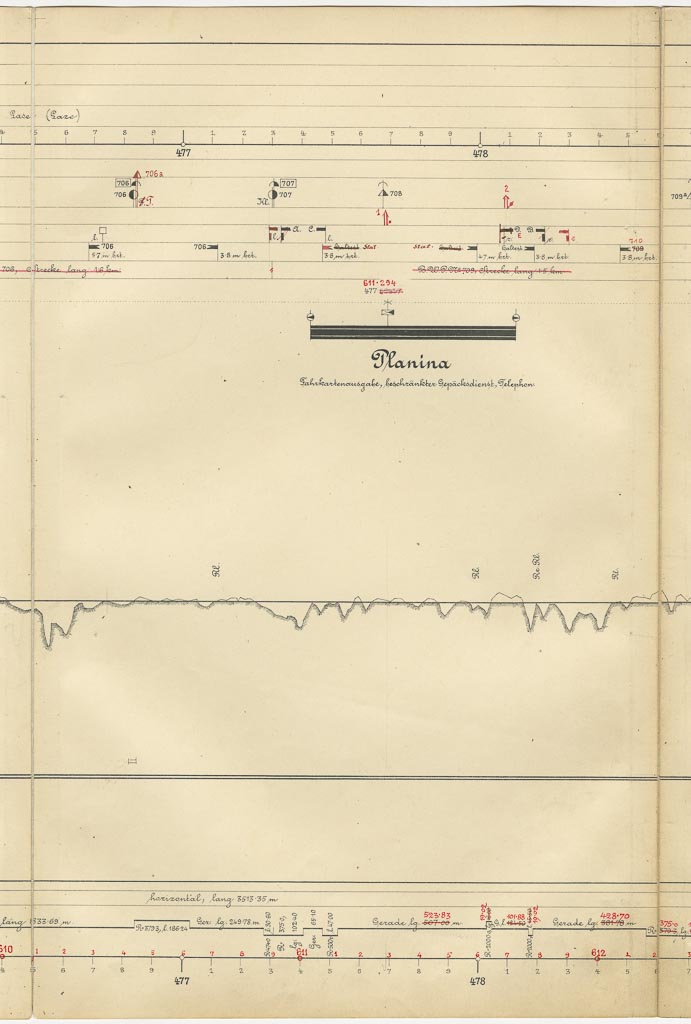 Po vzdolžnem profilu sodeč je Planina leta 1909 že bila železniška postaja, zavarovana z mehanskimi likovnimi signali. Predtem je bila nakladališče z enim krajšim stranskim tirom za nakladanje lesa. Na vzdolžnem profilu sta dve barvi pisave, črna in rdeča. V originalu je bil profil natisnjen s črno barvo še v času Južne železnice. Po letu 1924 (razpad Južne železnice) oz. v času med obema svetovnima vojnama pa so na vzdolžni profil ročno napisali še popravke z rdečo barvo. Črni kilometrski položaji v spodnjem delu profila predstavljajo razdaljo do Dunaja, rdeči pa do Beograda. Proga je tedaj potekala preko viadukta v Borovnici.