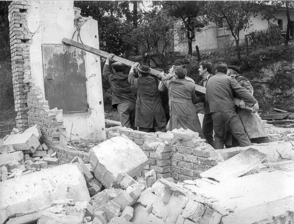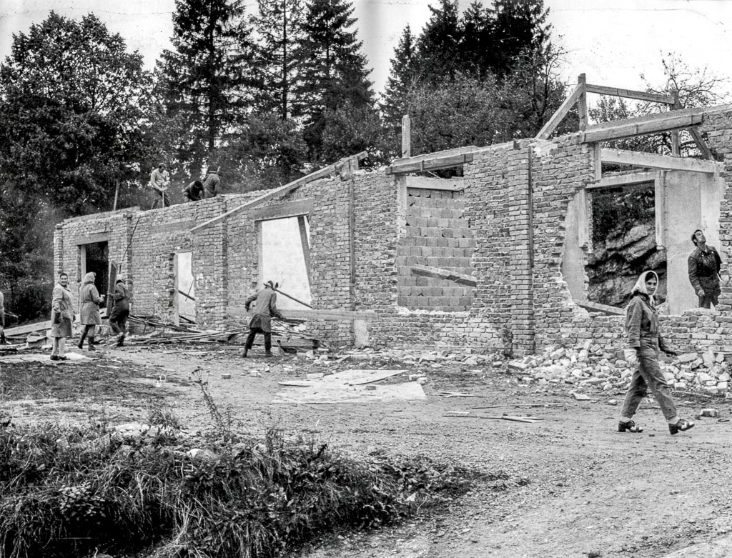 Še en od detajlov rušenja in odstranjevanja stare menze. Delavci brez ustrezne osebne in delovne opreme. Vendar z veliko volje. Vsa težja dela je opravljala moška delovna sila.