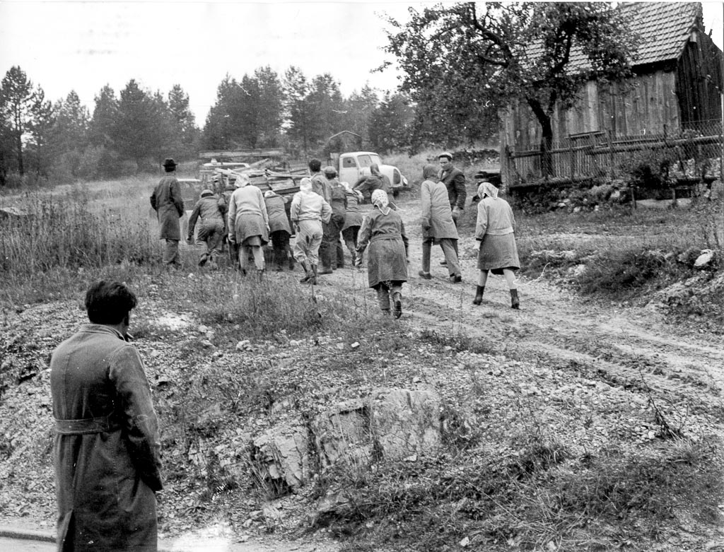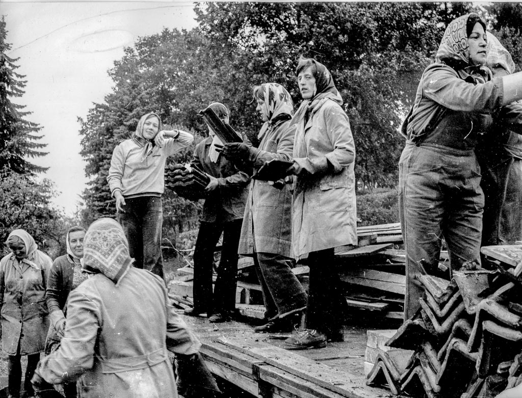 Vse delo so opravili delavci sami s prostovoljnim udarniškim delom, zavedajoč se, da lahko le tako hitreje pridejo do boljših pogojev dela in boljšega zaslužka. Prav poseben prispevek pa je bil dan s strani delavk. Vključile so se pri vsakem delu. Tu jih vidimo pri razkrivanju strešnikov in zlaganje le-teh na traktorsko prikolico.