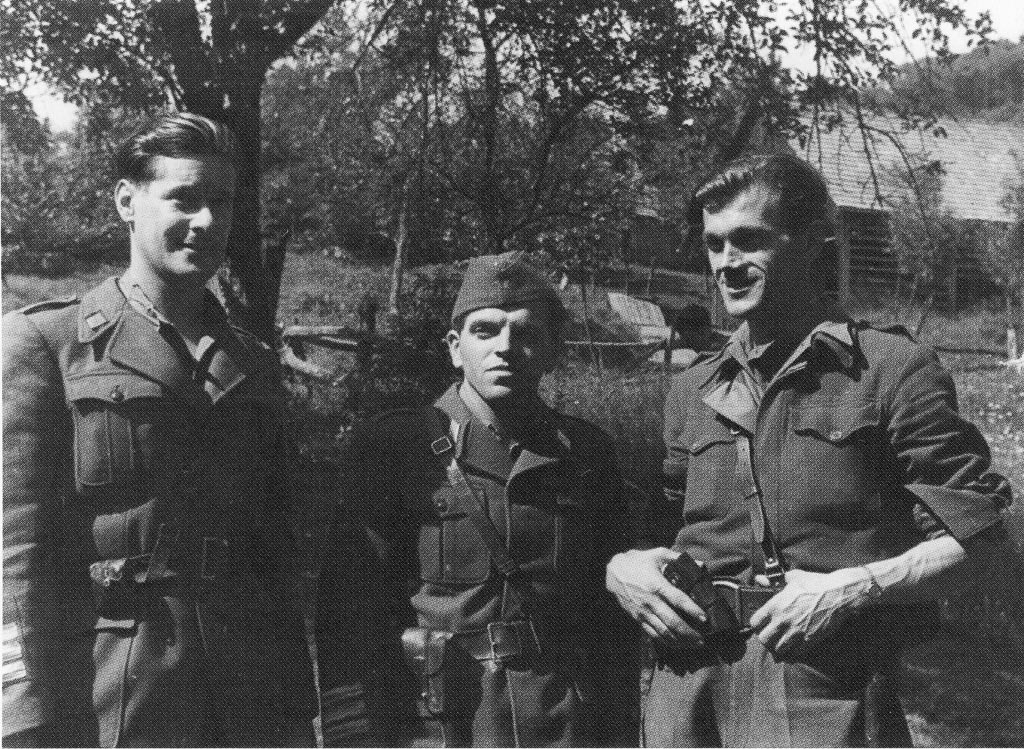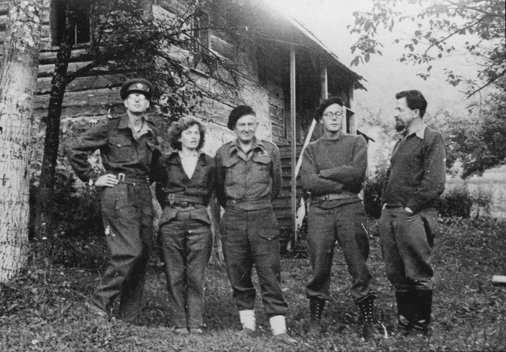 Vojni dopisnik BBC Matthews, Nada Kraigher, dr. Lindsay Rogers, angleški radiotelegrafist in Božidar Jakac, Srednja vas poleg Črmošnjic avgusta 1944.