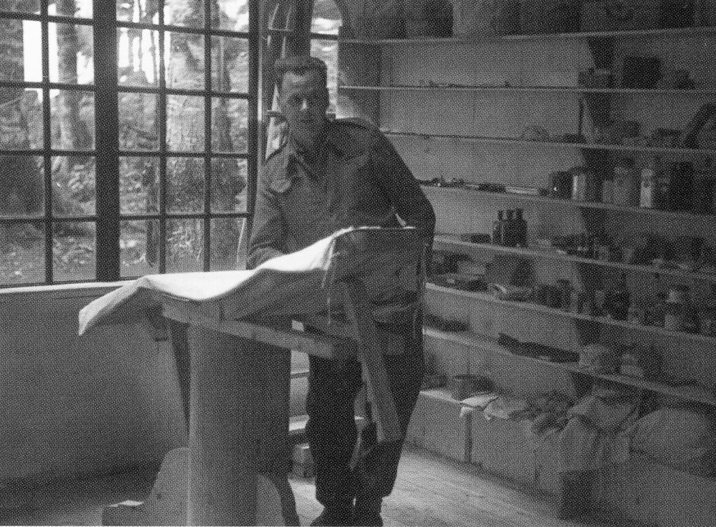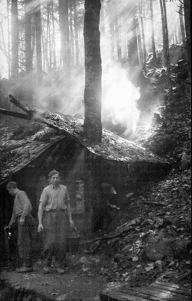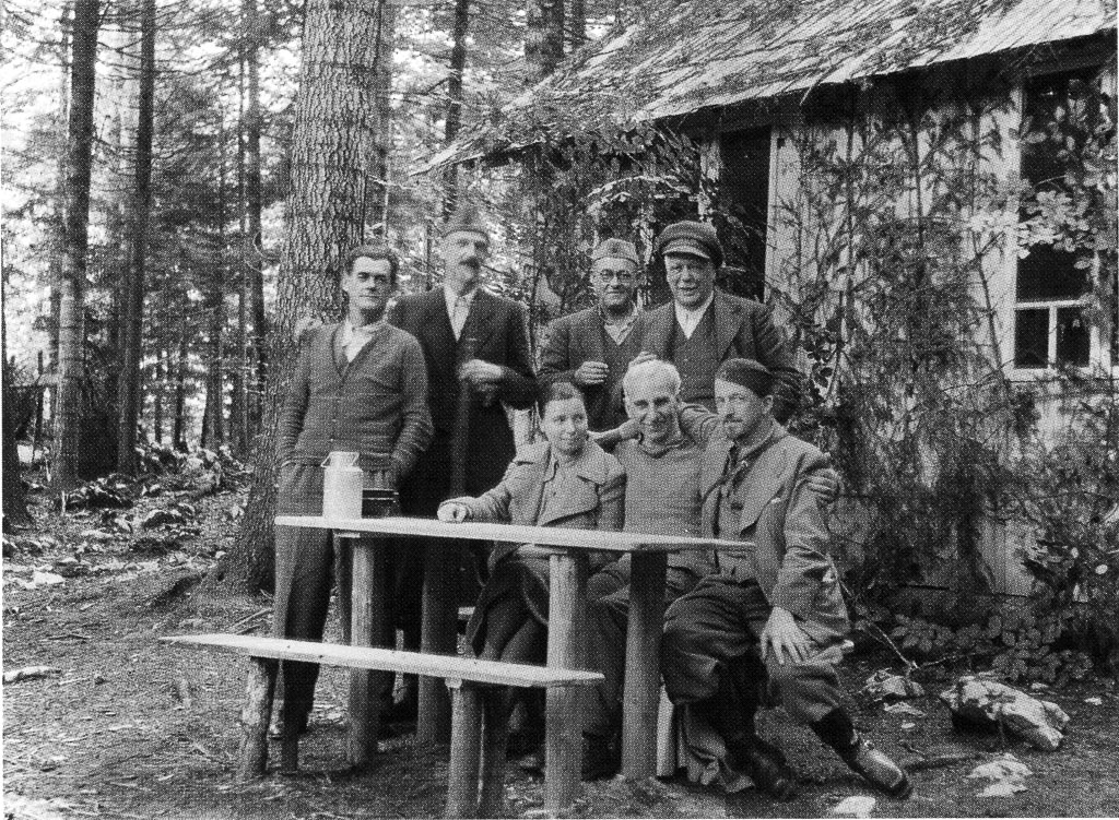 Baza 20, Kočevski Rog Pred barako stojijo z leve France Svetek, Makso Šnuderl, Josip Jeras, Dušan Sernec. Z leve sedijo Tatjana Jakac, major Jones, Božidar Jakac, jesen 1943.