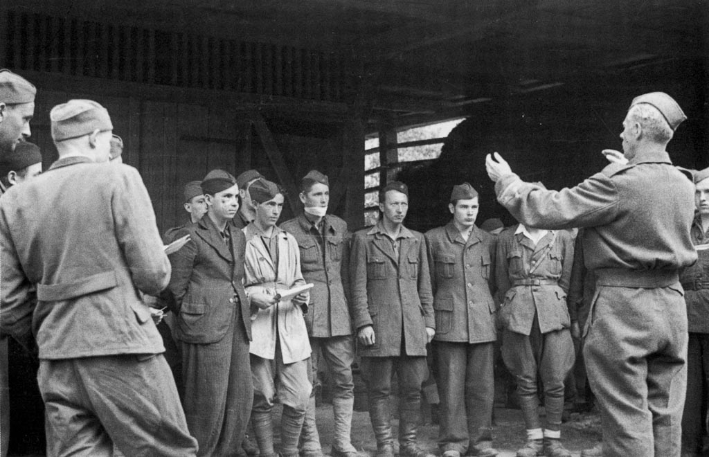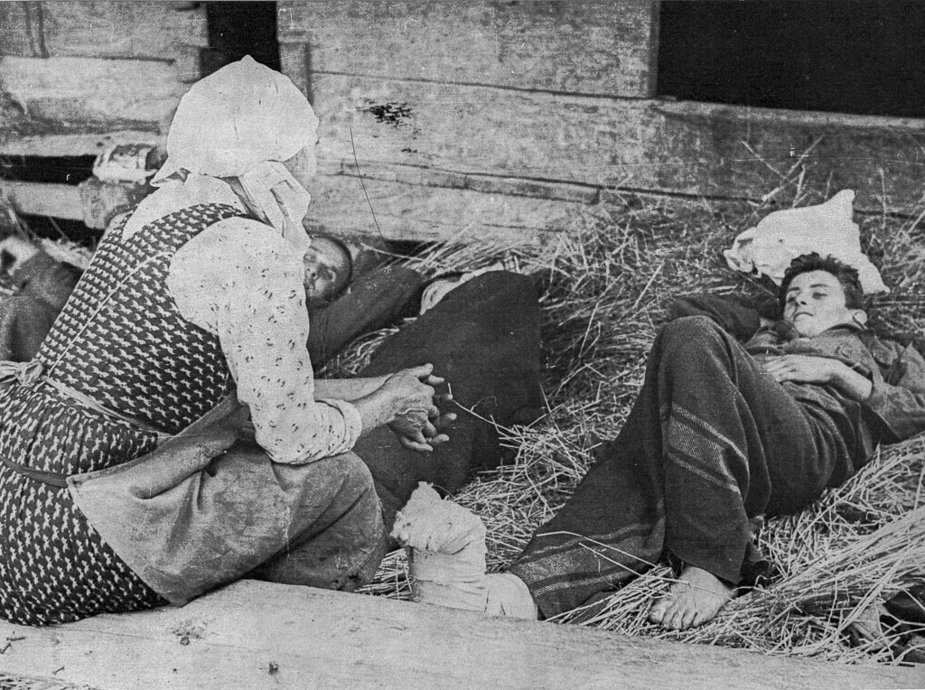Ranjenci iz bolnišnic Kočevskega Roga čakajo na prevoz na letališče v Belo krajino za evakuacijo v južno Italijo, poleti 1944.