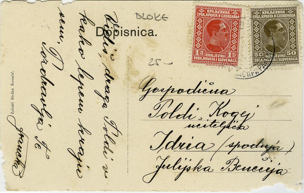 Razglednica je naslovljena na gospodično Poldi (Leopoldino) Kogej, ki je bila učiteljica v več slovenskih krajih. Rodila se je 11. decembra 1887. Prvi nastop službe je bil na Vojskem leta 1908. Kot je bila tedanja učiteljska praksa, so jo premeščali skoraj vsako leto: Št. Peter, Logatec, Hotedršica, Rovte in končno Idrija leta 1921. Dve leti kasneje je poučevala na Rudarski ljudski dekliški šoli v Idriji. Ona in Ljudmila Kočevar sta bili zadnji slovenski učiteljici, ki sta odšli iz Idrije in sicer leta 1928, Leopoldina 1. oktobra. Službena pot jo je zanesla v Preddvor, Tomišelj in na Brezovico. Umrla je v Ljubljani 12. maja 1972.