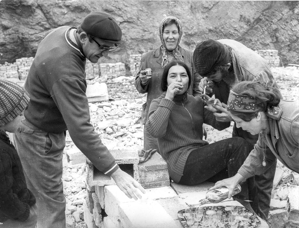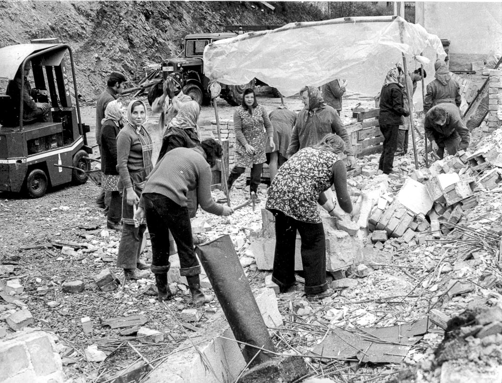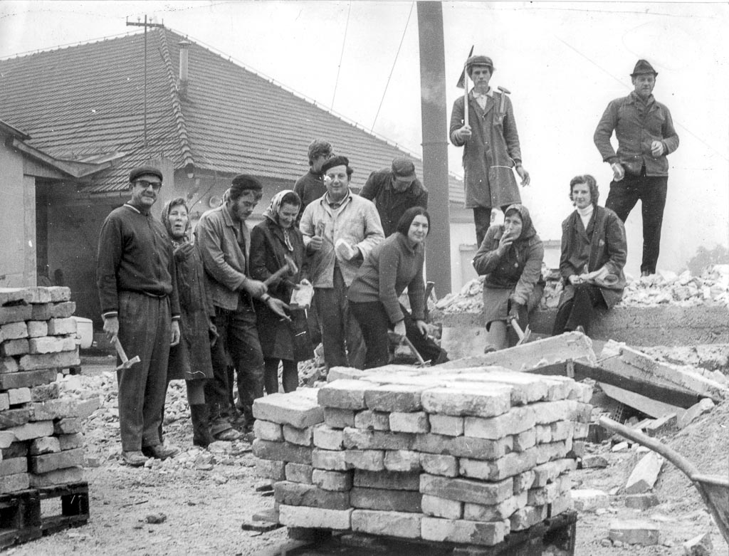 Delavke s kladivi čistijo opeko, oblečene bolj zimsko kot ne. V ozadju napeta ponjava bi bolj služila dežju kot pa senci. Levo stoji viličar, ki je verjetno odvažal očiščeno opeko.