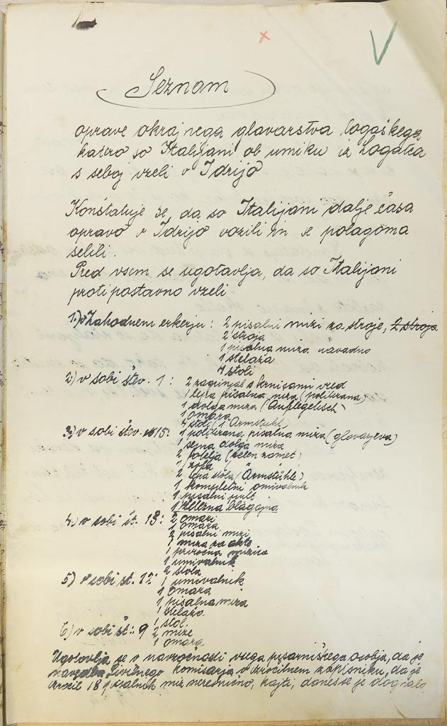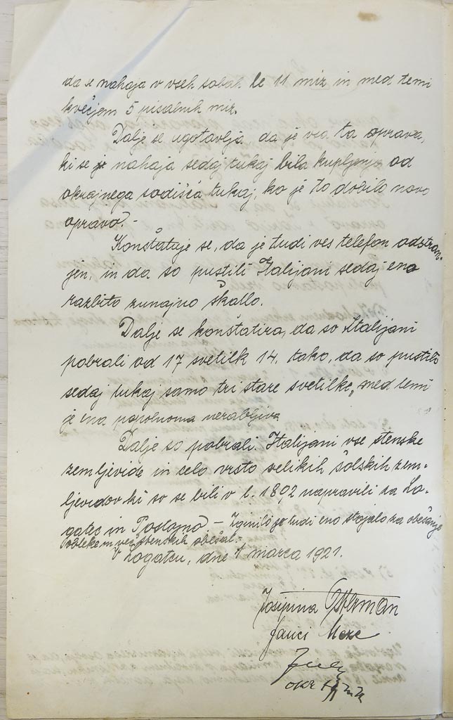 Konečno poročam, da so Italijani okr. glavarstvo v Logatcu popolnoma poropali ter vso opremo, ves inventar, vse katastre in vse spise prepeljali v Idrijo, tako da ni niti jednega komada več tam.