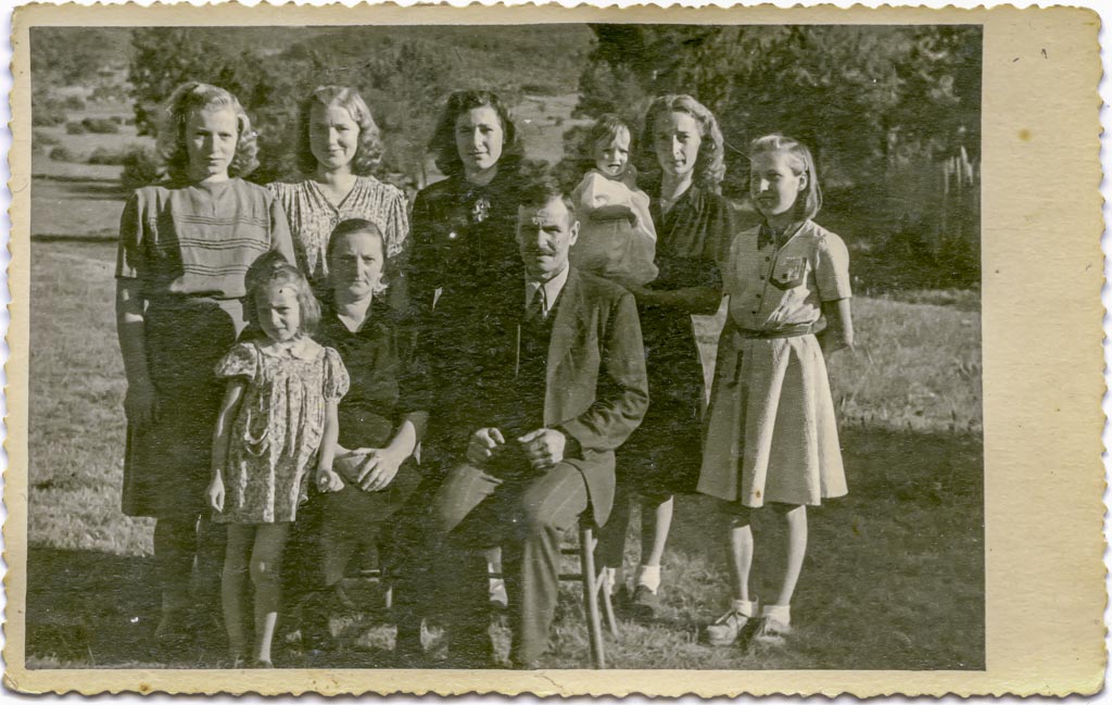 Od leve spredaj stoji Tilka, sedita mama Ivana in oče Jernej, zadaj stojijo od leve Micka, Polda, Ana, Iva s hčerko Marijo v naročju in Angelca.