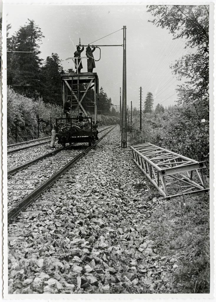 Delavci železniškega Podjetja za elektrifikacijo prog Ljubljana montirajo opremo za električno vozno mrežo na kovinski steber. Ob tiru leži še kovinska konstrukcija, ki bo nameščena za mejo zateznega polja električne mreže. Oprema in pripomočki za montažo so bili tedaj res improvizacija, ker je vsega primanjkovalo. Navaden dvoosni vagonček z lesenim odrom in lestvijo je bilo dovolj, da so fantje dosegli višino voznega voda, ki je 5,3 metra nad tirnico. Dogodek montaže vozne mreže je bil ovekovečen proti koncu leta 1954 na medpostajnem odseku Postojna-Rakek.