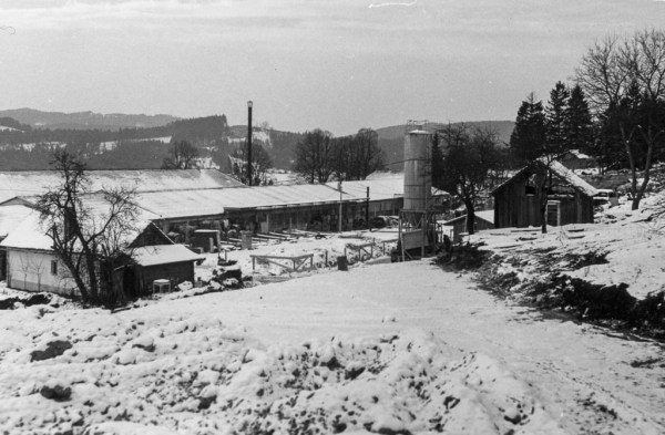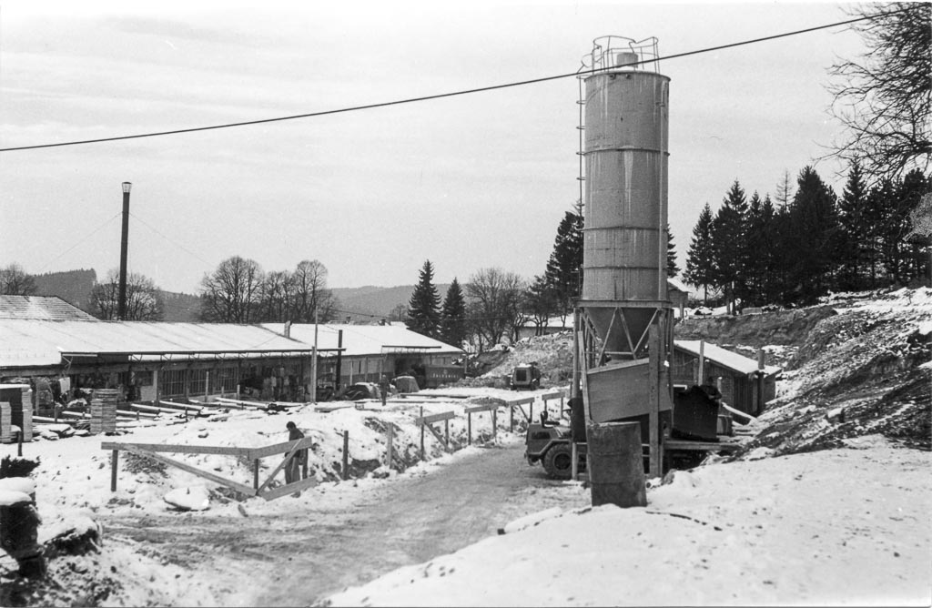 Eden od detajlov gradbišča v zimskem času. Na desni gradbeni silos. Levo hala B. Prav tako viden takrat še stoječ dimnik kotlovnice.