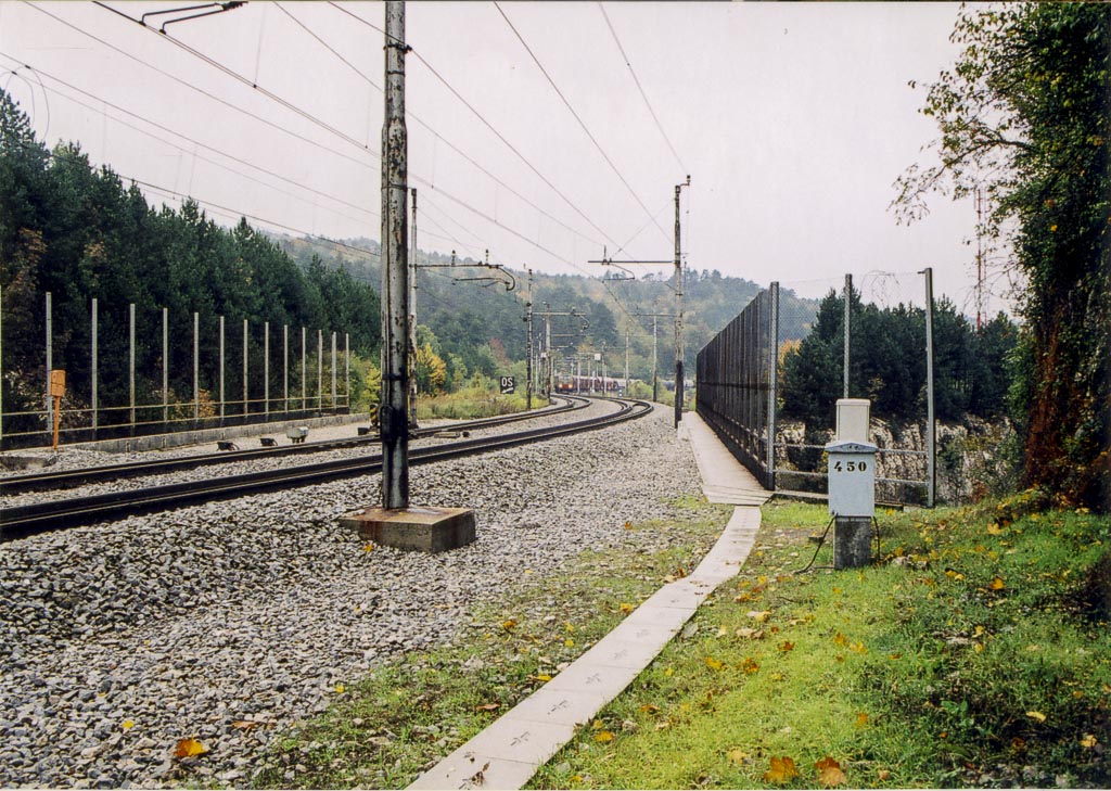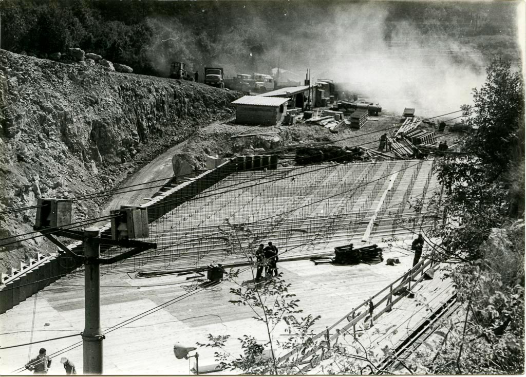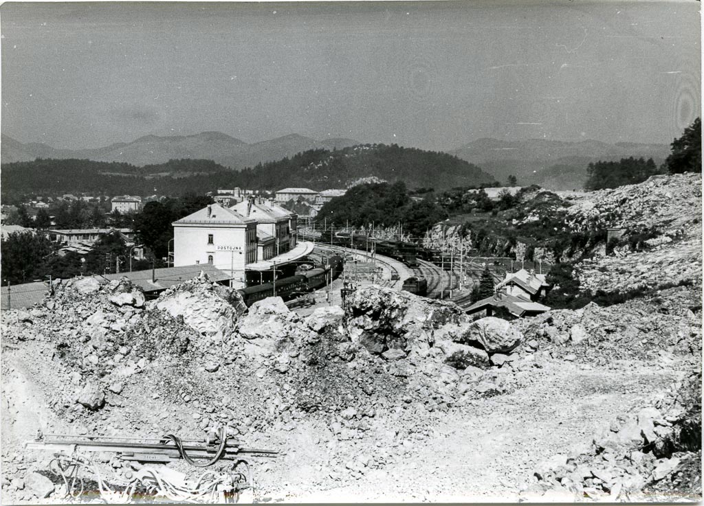 Pogled na železniško postajo Postojna s trase bodoče avtoceste. Tik pod hribom so vidni železniški objekti vključno s kurilnico in okretnico, ki jih je bilo potrebno porušiti. Avtocesta se je zajedla globoko v hrib nad železniško postajo in treba je bilo odstraniti na tisoče kubičnih metrov materiala, ki se je uporabil za avtocestne nasipe. V spodnjem levem kotu fotografije je naprava za vrtanje lukenj v skalo, v katere se vstavi eksploziv, se ga poveže z žico in sproži detonacijo v več vrtinah hkrati.