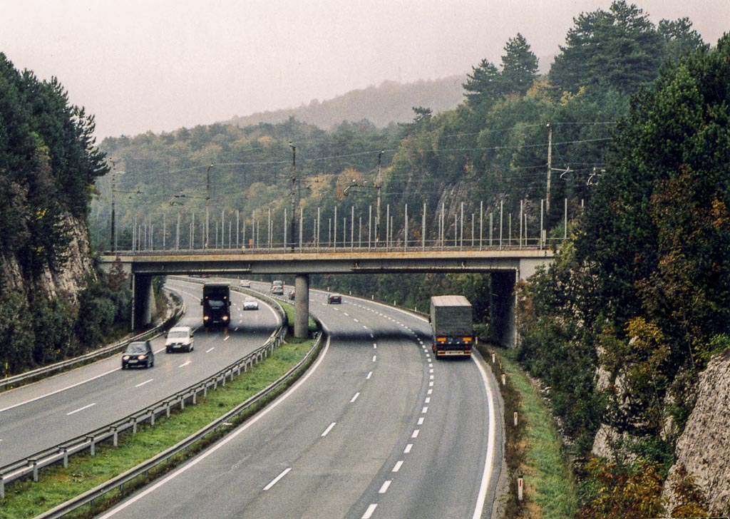 Pogled na podvoz v smeri Ljubljane, promet na avtocesti je v primerjavi z danes (2025) presenetljivo tekoč in brez zastojev. Čakamo le še na trenutek, da preko mostu zapelje vlak.