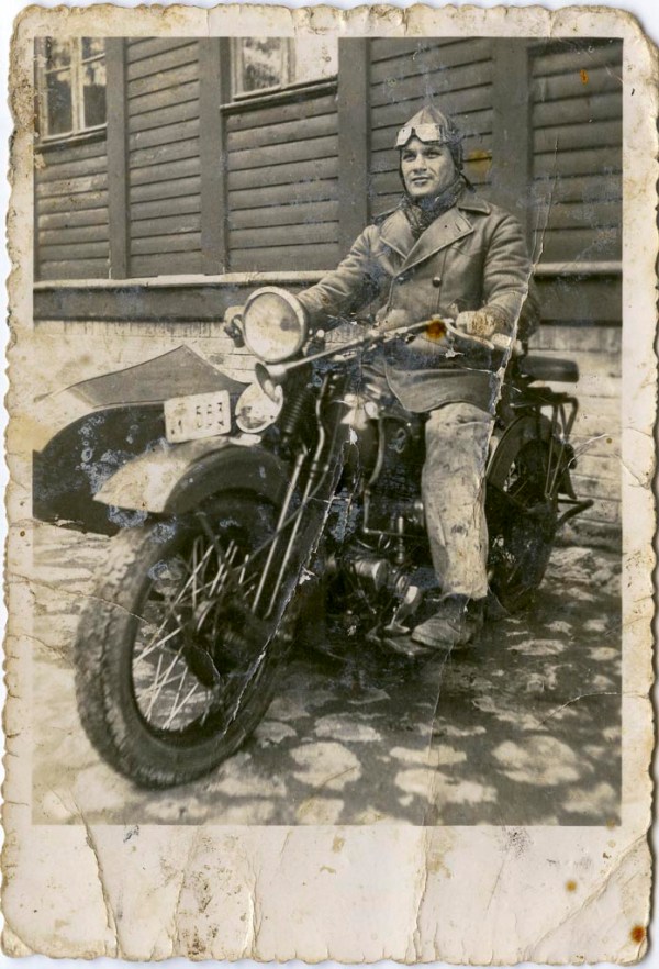 Slika prikazuje dobro opremljenega in zaščitenega Vinka Gaveza na motorju. Prizorišče je isto kot na zgornji sliki, domnevno v Beogradu.