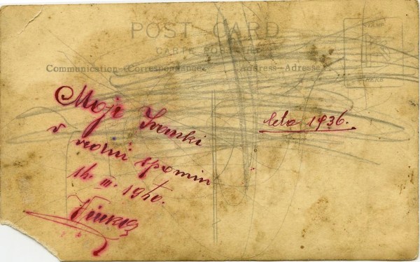 Fotografijo je Vinko podaril svoji Ivanki in nanjo 14. marca 1940 s pisavo, ki razkriva urejenega človeka z občutkom za lepoto, ganljivo zapisal: Moji Ivanki v vedni spomin. Dodal je še letnico nastanka slike: leta 1936, ko je imel 28 let in brčice.