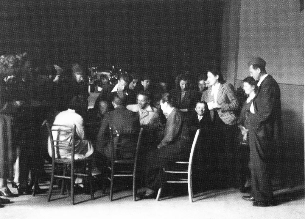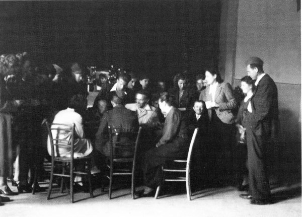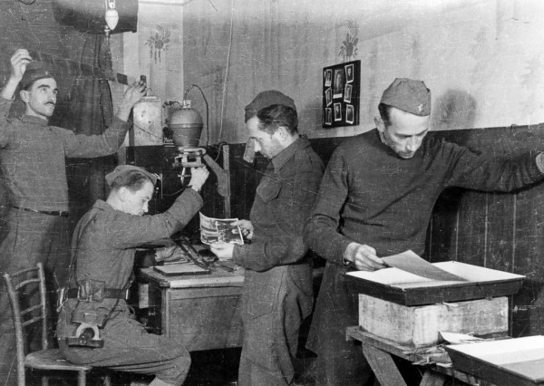 Delo v Fotosekciji SNOS za razstavo v hotelu Lackner v Črnomlju. Od desne proti levi: Daro Kopinič, Franjo Veselko, Maksimilijan Zupančič in Edi Šelhaus, foto Franjo Veselko, 17. decembra 1944.
