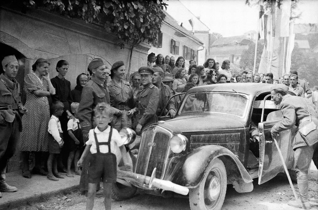 Prihod ameriške in sovjetske vojaške misije na proslavo ob prazniku slovenskih in hrvaških partizanskih enot, Metlika 9. julija 1944.