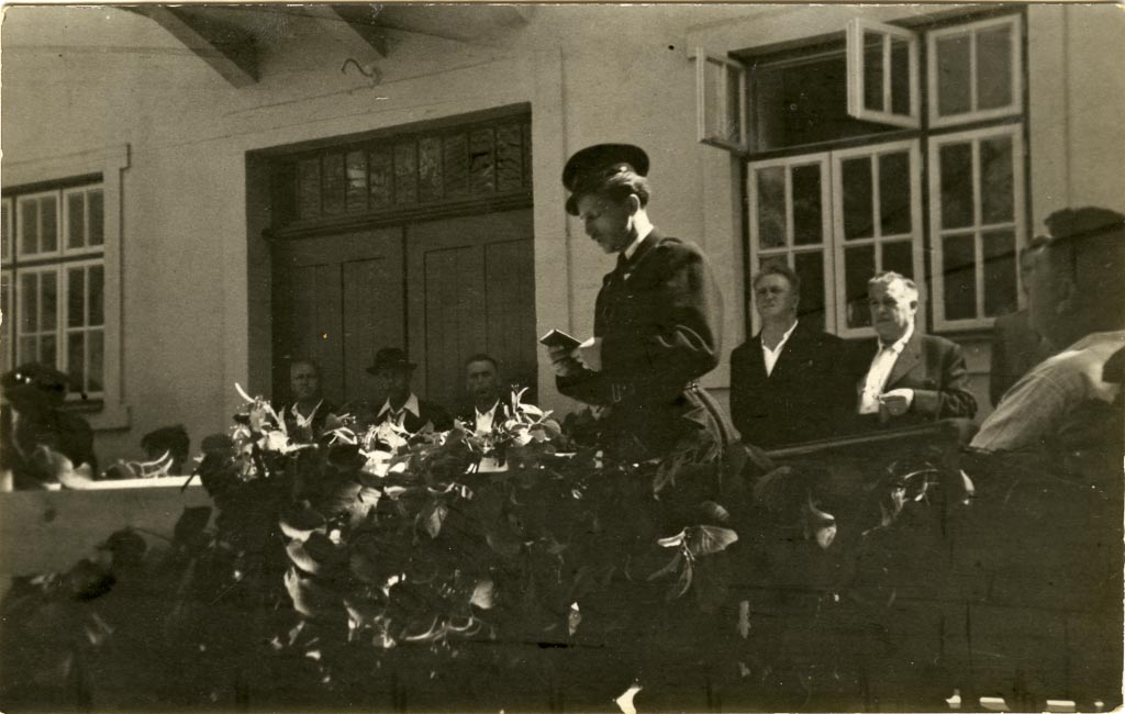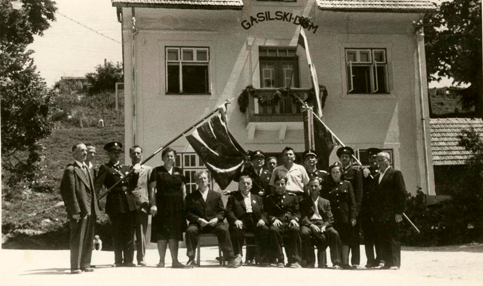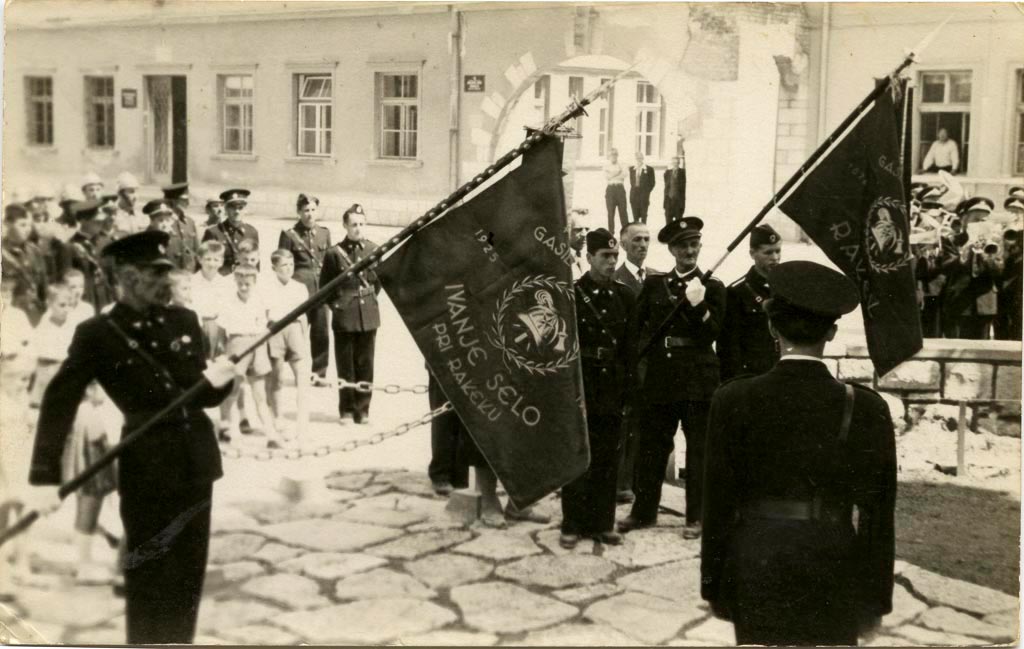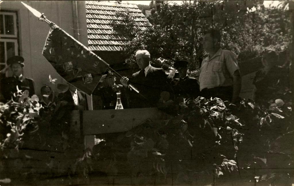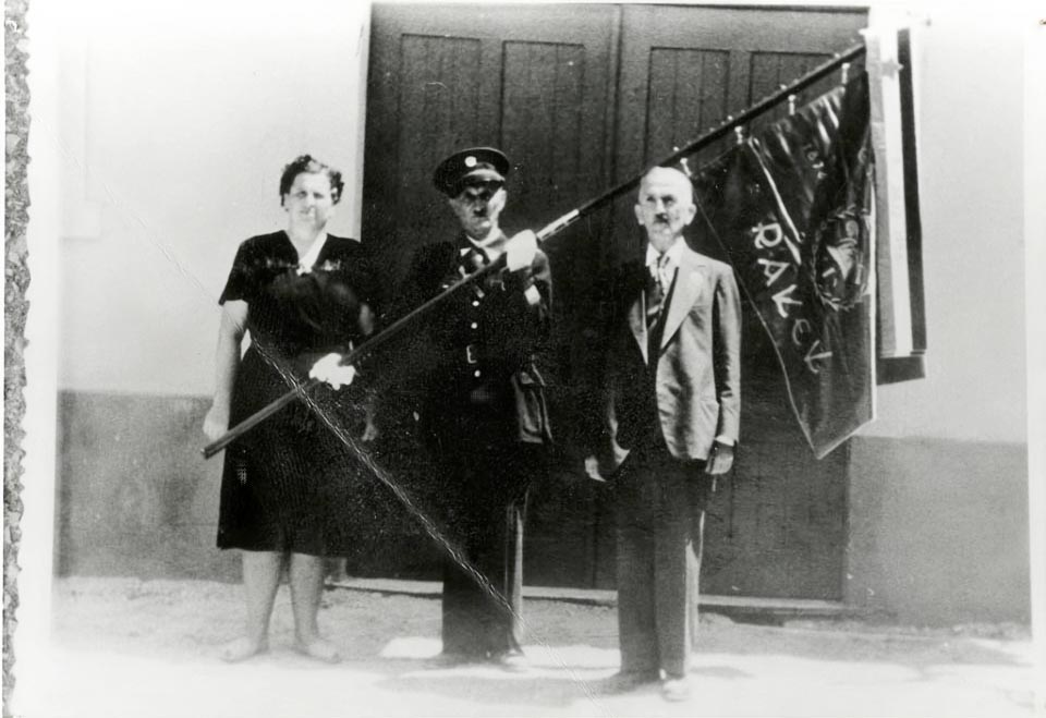 Osmega julija 1956 je društvo slavnostno razvilo svoj prapor in slovesnost združilo s parado po Rakeku. Na sliki je Janez Steržaj, ki ima govor pred Gasilskim domom.