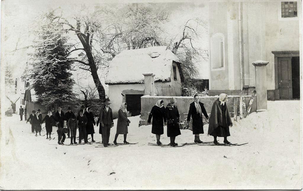 V Litiji rojeni Metod Badjura, filmski režiser, snemalec in scenarist je leta 1932 posnel večkrat nagrajeni dokumentarni film Bloški smučarji. Temo mu je predlagal brat Rudolf, avtor prvega slovenskega smučarskega učbenika. No in tako je po vsej verjetnosti nastala tudi naša današnja slika. Po poti k cerkvi gredo “po smučeh” ženske, moški in otroci. Nekateri so že v cerkvi, njihove smuči so naslonjene na cerkveni zid. Po vsej verjetnosti gre za igran prizor, saj so vsi zakmašno oblečeni, pri bližnjih hišah pa stojijo firbci. Snega ta dan ni bilo prav veliko in pot do cerkve so vsi opravili brez sicer obvezne palice ali kola.