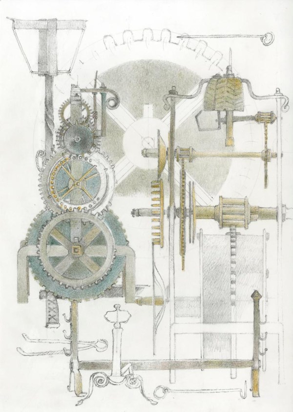 Risba urnega mehanizma mehaničnega ražnja in njegovih delov, barvni svinčnik, avtor Josip Korošec, 2013.