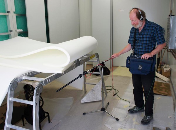 Strokovnjak za zvok Boštjan Perovšek med snemanjem zvoka urnega mehanizma mehaničnega ražnja, Restavratorski center, 2013. Foto: Valentin Benedik.