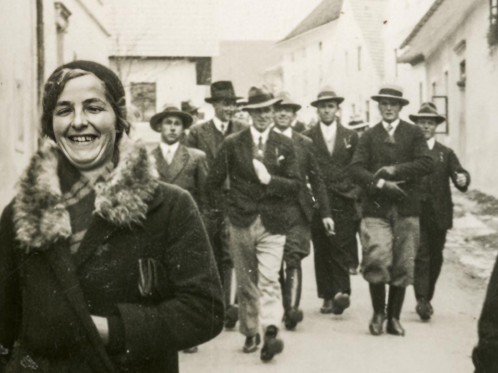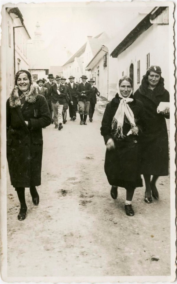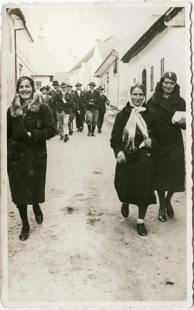 V ospredju živahnega dogajanja so tri nasme(hl)jane mlade, bolj po mestno odpravljene ženske. Prva, Francka, ima na glavi kapo ali sploščen klobuček, druga, njena sestra Marija, nosi pod brado v pentljo zavezano svileno šerpo, tretja koketen klobuček. Plašči s krznenimi dodatki so cevasto krojeni, pod pazduho prve z leve se stiska torbica, zadnja drži v rokah svetal zavitek (je v njem morda spotoma nabavljeno meso za nedeljsko juho?), dlani vseh treh pa so gole – torej ni bilo pretirano mraz. Zato imajo lahko na nogah vse tri zloščene nizke šulence in temne nogavice, mogoče svilene, srednja pa še bombažne kratke povrh.