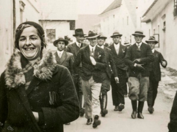 Fotograf jih je posnel med gibanjem, zato hlačnice plapolajo okoli nog, čevljem pa se vidijo podplati, ko jo moški jadrno mahajo navzdol proti Žumrovi gostilni onkraj ceste in spotoma glasno govorijo. Veljajo nasmejani obrazi oseb na sliki kozarcem vina, ki si jih obetajo ali dobrovoljnim opazkam, ki letijo k dekletom pred njimi – a fotografu, da bi bili na sliki videti lepši, skoraj gotovo ne, še zmenijo se ne zanj. (Me vpraša Miloš: “Kaj si misli ženska, če moški nič ne žvižgajo ali komentirajo, ko gre mimo?” Nič, kaj naj si misli: da je nekaj narobe z njimi! Ali pa z njo … ) Ali so sproščeni smehljaji na sliki samo odraz olajšanja, da so še enkrat opravili svojo krščansko dolžnost, se morda olajšali grehov in preživeli še eno bolj ali manj dolgočasno (praznično?) pridigo … ? Vzdušje ta trenutek kar brenči od pričakovanja in dobre volje …