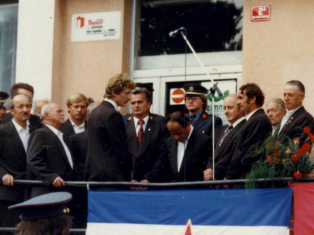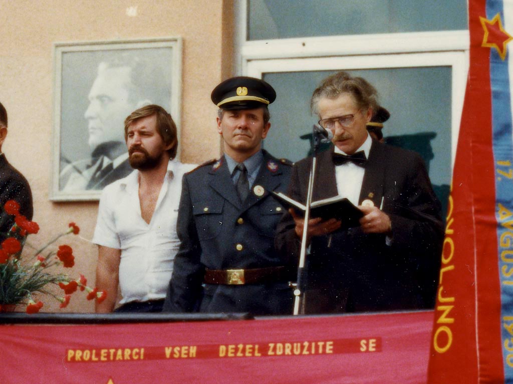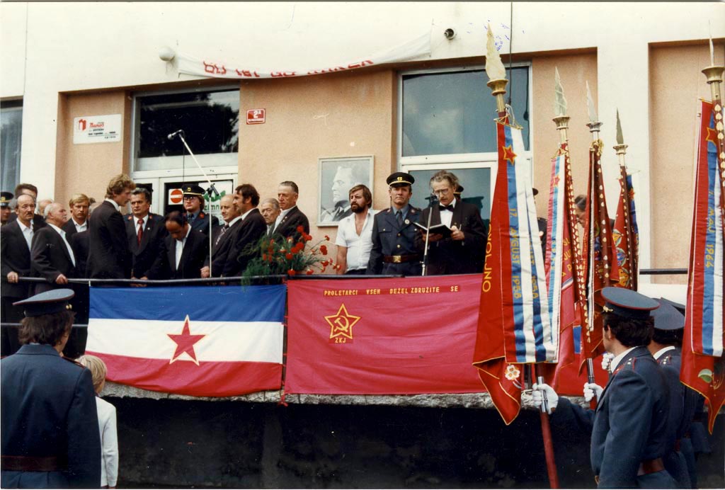 Slovesnost se je odvijala pred poslovno stavbo podjetja Nanos tam, kjer je bila kasneje pekarna, še kasneje pa trgovina Tuš. Na ograji visita jugoslovanska in partijska zastava, slednja z napisom »Proletarci vseh dežel, združite se.« Danes je bolj v modi parafraziran reklo: »Proletarci vseh dežel, zdržite še.«