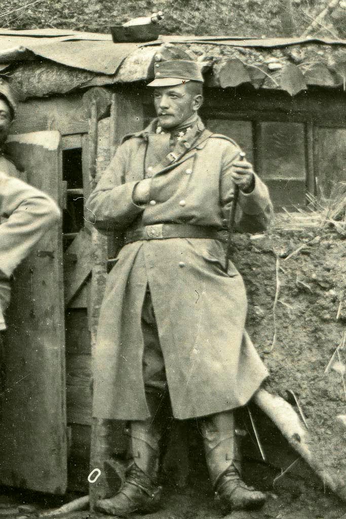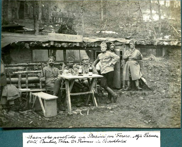 Na vrhu Plazini (SZ od kraja Bardejov) v Karpatih pred pod zemljo zgrajenim bivališčem je slikano poveljstvo. Nad zemljanko je napis »Theuer Heim« – Theuerjev dom. Ta je bil major in je na sliki prvi z leve. Poleg njega je oberleutnant (nadporočnik) Paulus, dr. Rado Primic in dva vojaka. Skrajni desni, ki je zavzel Napoleonsko držo, je Leopold Graf Berchtold. Verjetno je prišel v kontrolo.
