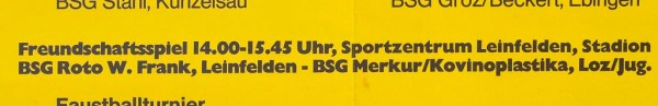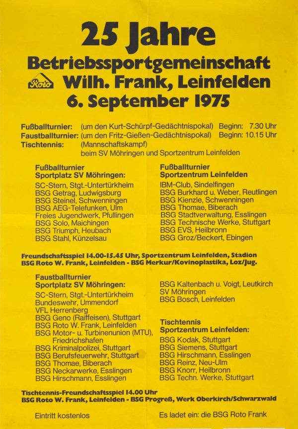Doma sem ohranil uradni plakat organizatorja Betriebssportgemeischat (športno društvo podjetja) Roto Frank. Na jubileju je sodelovala množica moštev na nogometnem turnirju, turnirju v odbojki s pestjo (Faustball) in namiznem tenisu. Odbojka s pestjo je posebna različica odbojke, zelo popularna v nemško govorečih deželah in Braziliji.