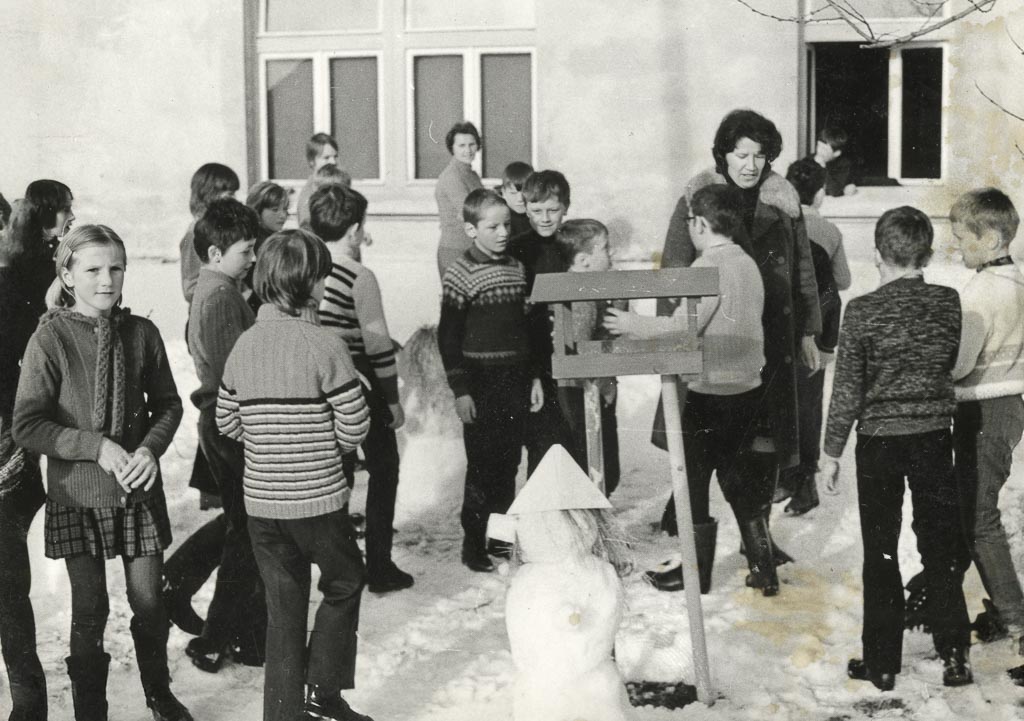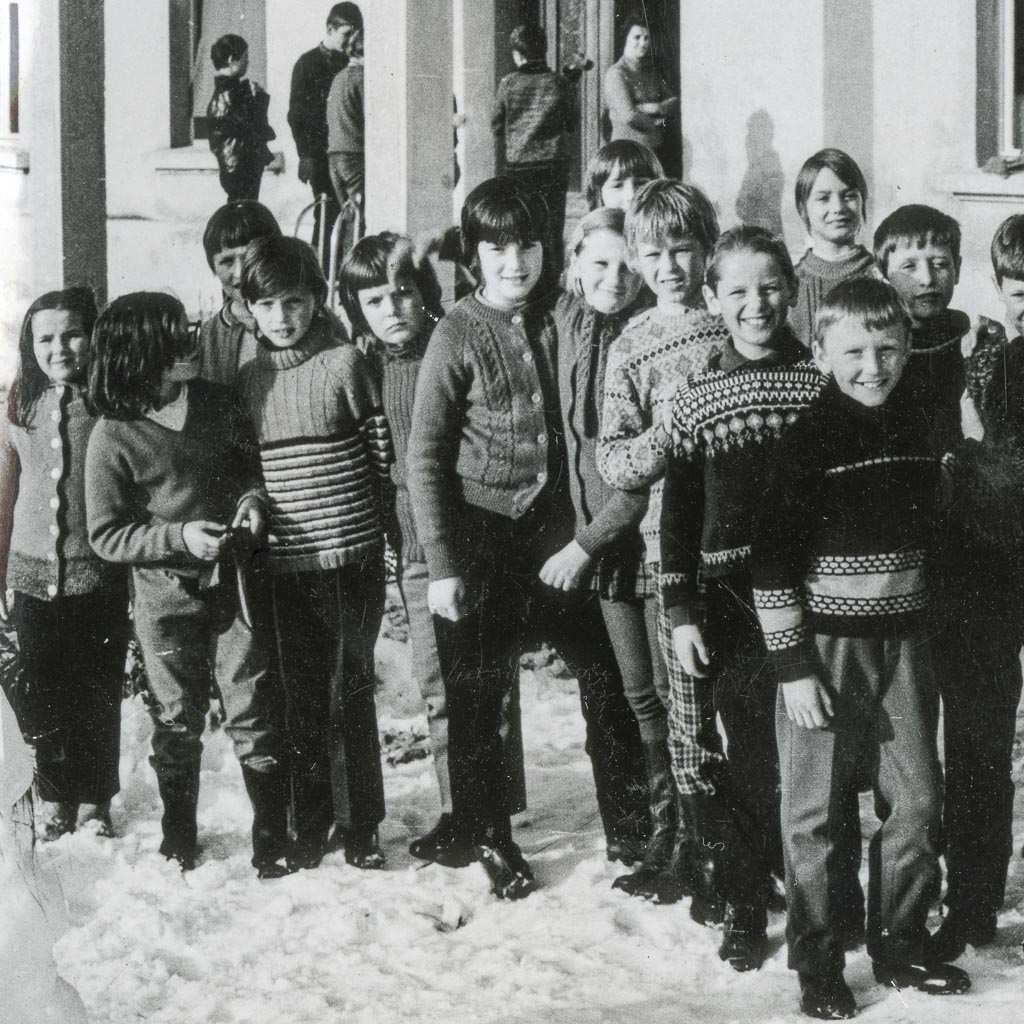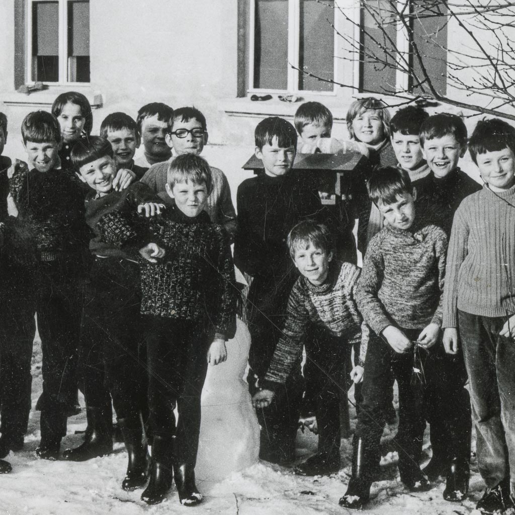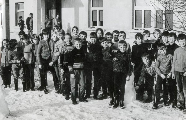 Zimske radosti učencev 3. razreda pred osnovno šolo Rakek v šolskem letu 1971/72. Vsi učenci so domačini z Rakeka.