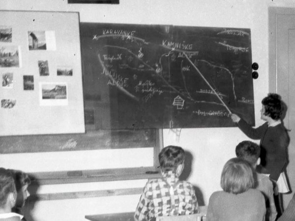 Učiteljica je pred začetkom pouka na tablo z raznobarvnimi kredami narisala potrebno sliko. Na fotografiji so se očitno učili gorstva, saj so na narisanem zemljevidu označene Karavanke, Kamniške in Julijske Alpe, Dolenjsko gričevje, Kozjak pa še marsikaj, kar z nekoliko neostrega zemljevida ni razločno.