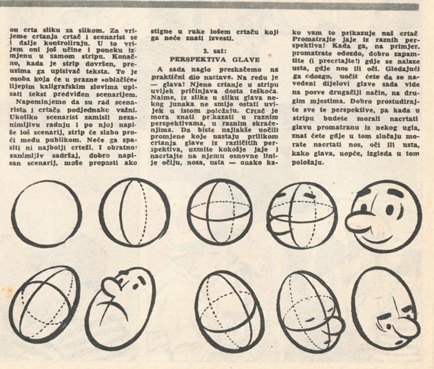 Zagrebški mladinski stripovski tednik Plavi vjesnik, ki smo ga kupovali v nekdanji cerkniški trafiki poleg pekarne, je tedanje bralce in zbiralce tovrstne literature razveselil z odlično pogruntavščino. V svoji jubilejni petstoti številki, natisnjeni 23. aprila 1964, je začel objavljati šolo stripa, navodila za risarje začetnike. Napisal in narisal jih je znani stripovski avtor Žarko Beker, ki je poznavalsko predstavil vse najnujnejše, kar naj bi mladi risar vedel, preden se spopade z deveto umetnostjo. Na sliki je del drugega nadaljevanja, ki nas poduči o risanju glave.