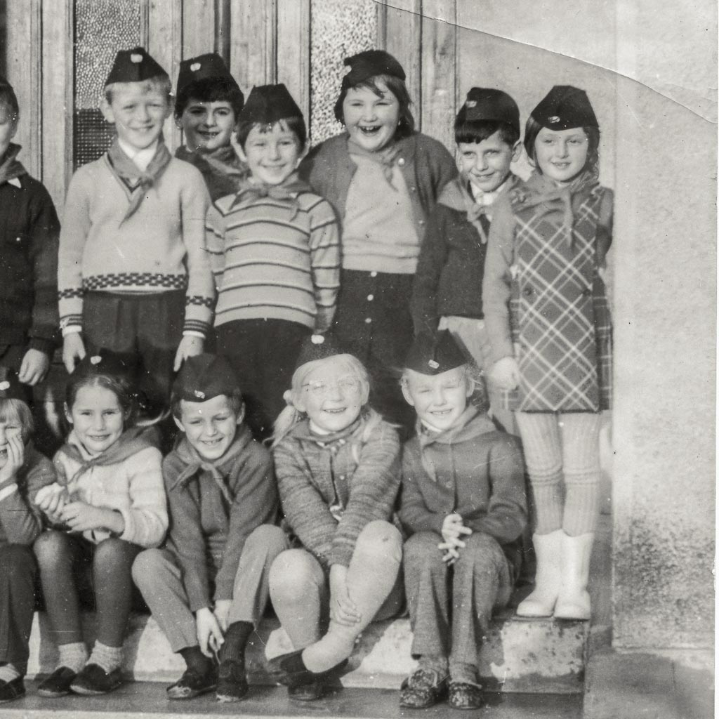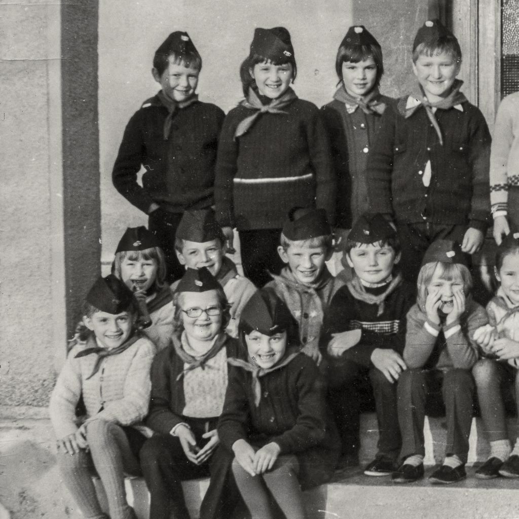 Veseli in ponosni pionirčki iz šolskega leta 1972/73 pred osnovno šolo na Rakeku. Sprejem v pionirsko organizacijo je potekal na dan republike, 29. novembra.