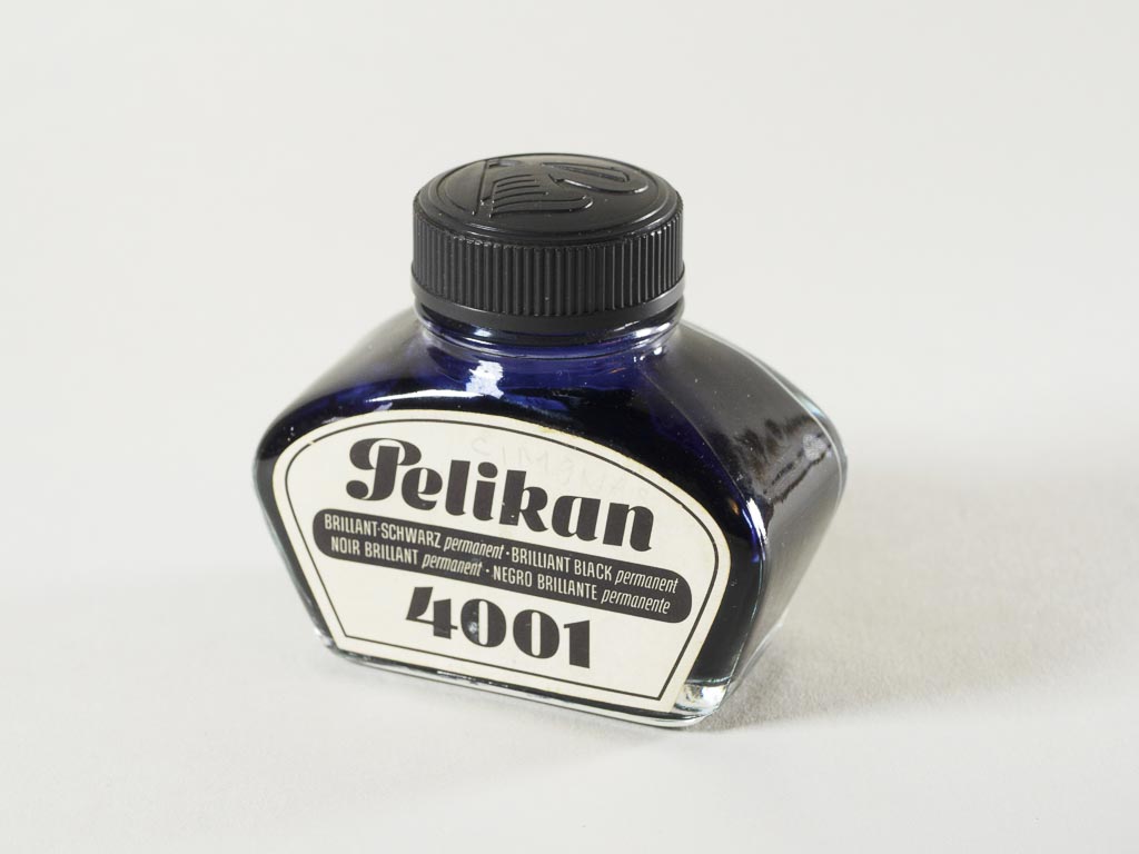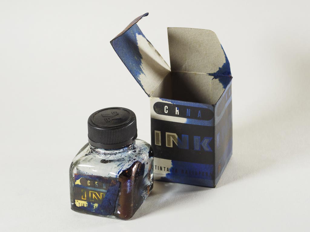 Na sliki je steklenička s črnilom. Leta 1838 ga je začelo izdelovati nemško podjetje Pelikan, ki je bilo istega leta tudi ustanovljeno. Devetdeset let kasneje so izdelali svoje prvo nalivno pero. Črnilo je bil velik uspeh, ker ni bilo več potrebno sliniti tintnega svinčnika, da bi besedilo obstalo. Ko pa so »izumili« še tintenkiler oziroma brisač tinte – po naše brisalec črnila, je bila zmaga zagotovljena. Danes le še malokdo piše s črnilom in nalivnim peresom. Imajo pa tinte vseh barv v bombicah, od rumene do črne. Sem si jih kupila. Ne glede s katero barvo pišem, ne vidim nič, razen z modro in črno.